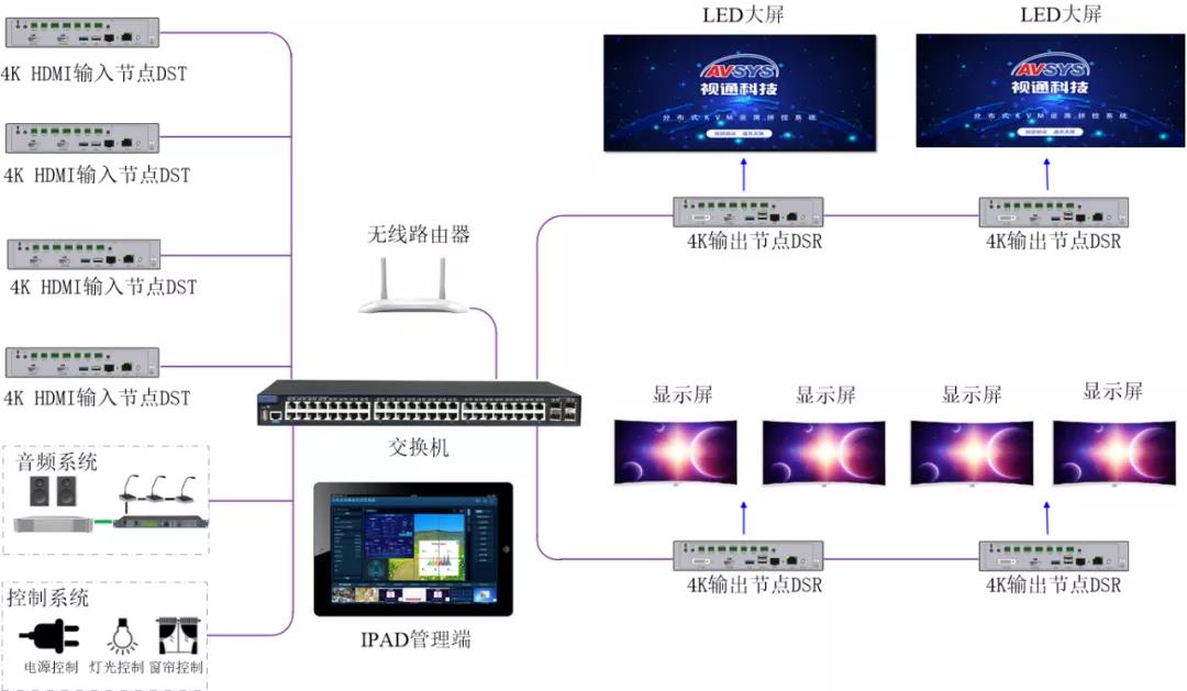 1.高清分布式LED拼接,切换、开窗、跨屏漫游、轮巡轮切。
