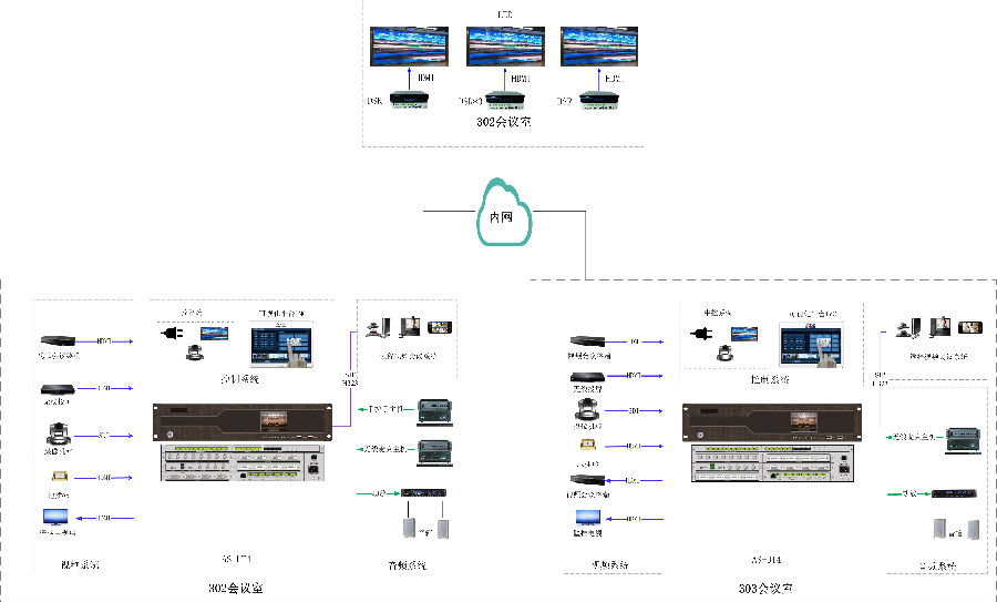 (2)项目包含:本项目共建设2间会议室,使用2台K1体育科技(AVSYS)UT4录播主机、5台DSR分布式设备,实现统一控制管理,音视频调度等应用。
